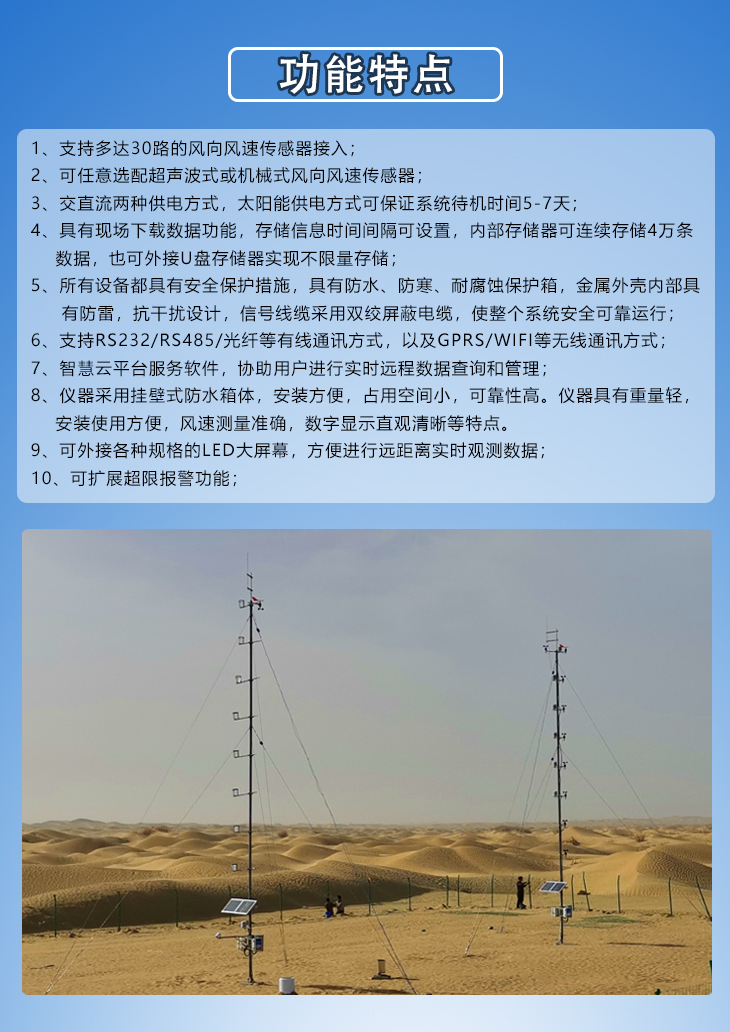 由于受到地表摩擦的作用,接近地表的風速隨著離地面距離的減小而降低,造成同一位置不同高度的風速風向存在差異,這樣就會對一些行業運行產生影響。我公司生產的PC-2F型多通道風向風速監測站是由新一代的多通道風速風向監測記錄儀與風向風速傳感器組成的,用于觀測記錄同一位置不同高度的風向風速瞬時值及平均值的專業設備,具有測量精度高、人機界面友好、人工干預少、交直流供電等特點。
