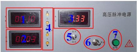 2.3、 3是脈沖電壓顯示:可通過(guò)下面旋鈕來(lái)加減,0 ~ 8KV可調(diào)。
