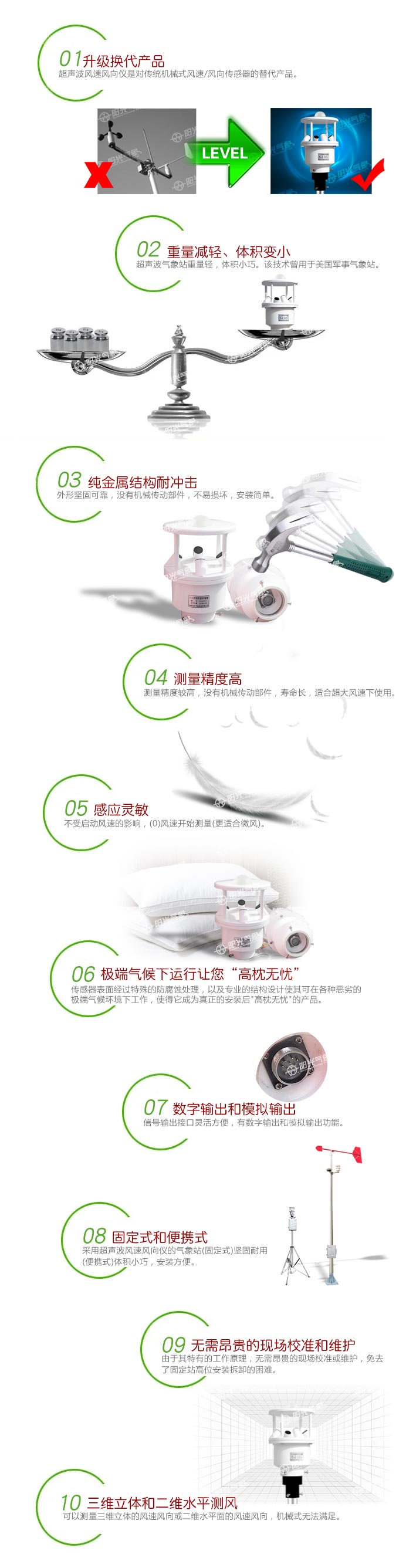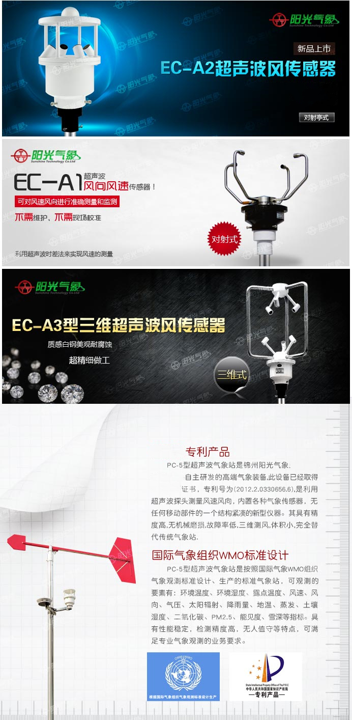 氣象站采用超聲波探頭來測量風速和風向,沒有任何移動部件,儀器結構緊湊,更加耐用,數據更加可靠。也可用內置的溫度、濕度和氣壓傳感器等傳感器探頭監測相關氣候指標。精確的測量數據可以幫助氣象、水利、交通及科研等組織提供精確的數據依據及判斷條件。