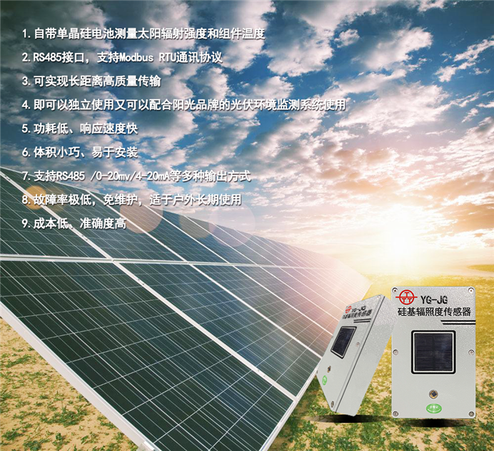 硅基輻照度傳感器是錦州陽光氣象科技有限公司根據太陽能電池板的特性,專門為光伏發電行業研制的一款低成本、高可靠性的太陽輻照度測量傳感器。其傳感器的本身,采用硅基結構與光伏板的結構及其相似,是一個十分理想的參照系統。特別是它的光譜響應以及傾斜誤差都與光伏板極其相似,這讓使用硅基傳感器來精準的分析光伏板輻照度數據,有據可循。
