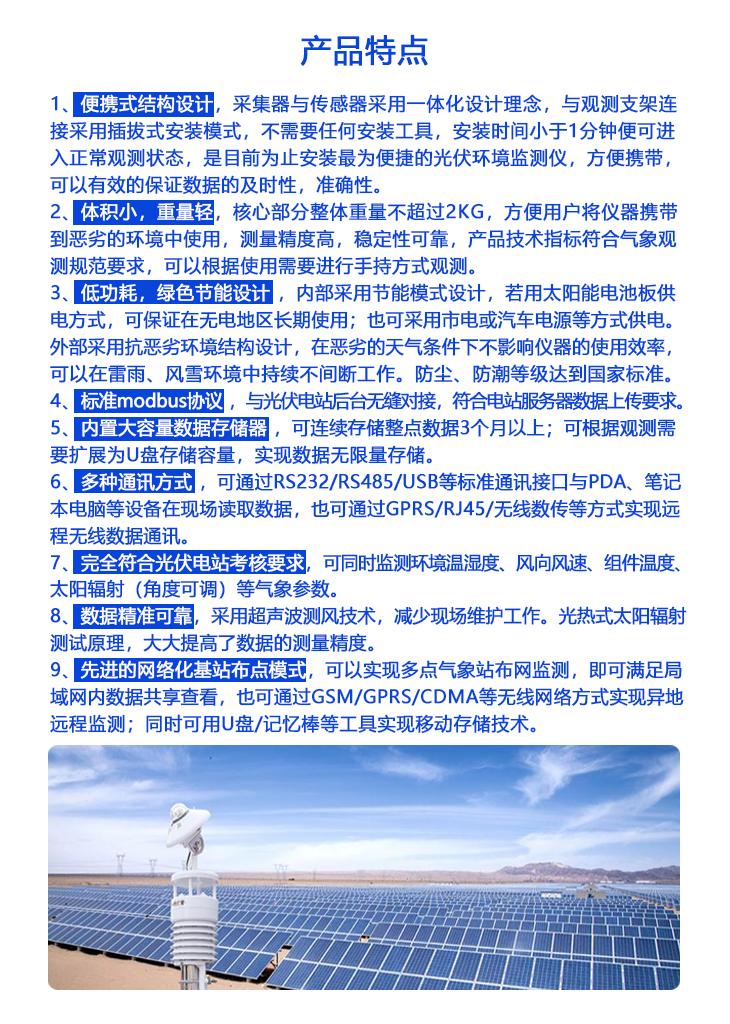 本產品是針對光伏發電站研發生產的一款最新型一體化光伏環境監測儀,該設備采用新型一體化結構設計,測量精度高,安裝使用方便,可采集多種要素:含太陽輻射(水平/斜面)、溫度、濕度、風速、風向、大氣壓力、背板溫度等要素,要素可按需定制。