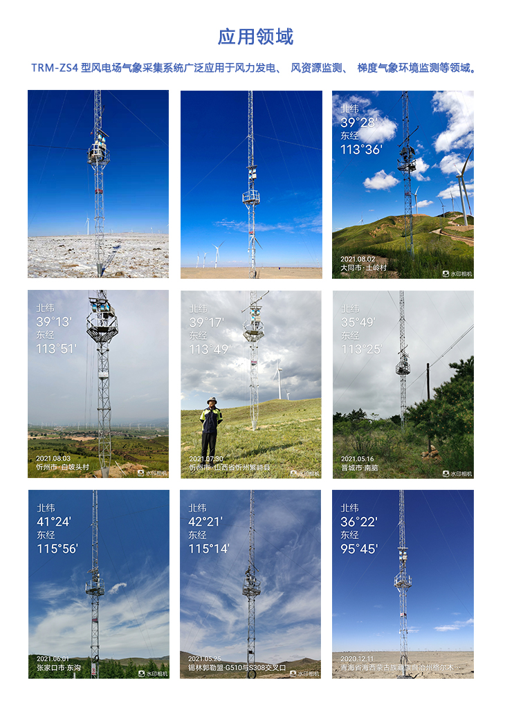TRM-ZS4型風電場氣象采集系統是風電功率預測系統重要組成部分,主要負責采集氣象預報數據,包括測風塔梯度風速、風向、溫度、濕度以及氣壓等實時數據、并對數據進行分析處理和統計,再實時輸出給風功率預測系統,為風電場的風電功率預測工作提供可靠數據。TRM-ZS4型風電場氣象采集系統由氣象傳感器、微電腦氣象數據采集儀、太陽能電源供電系統、全天候防護箱和氣象觀測支架、通訊模塊等部分構成。