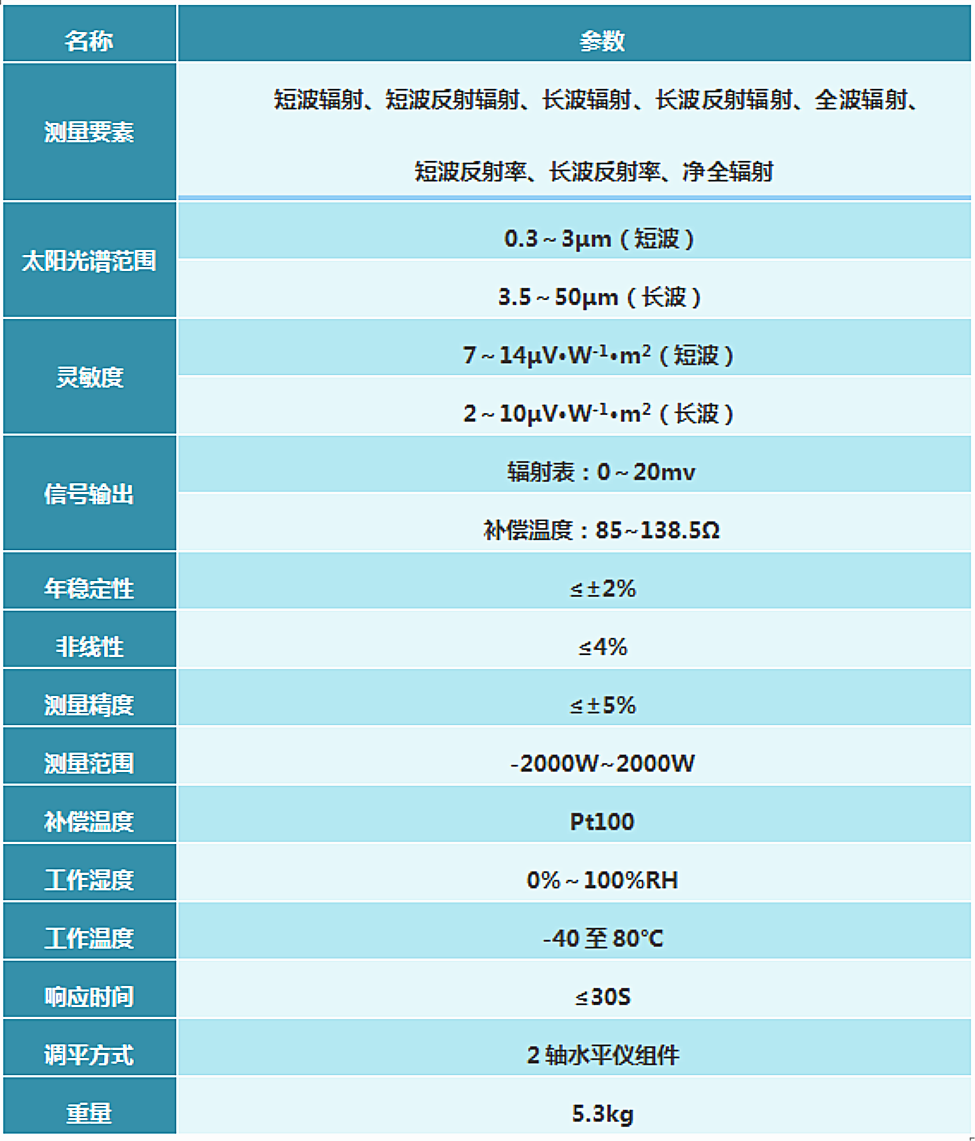 每只輻射表都分別有各自的靈敏度系數(shù)和輸出導(dǎo)線,可單獨(dú)輸出各個(gè)數(shù)據(jù),同時(shí)通過(guò)各自的輸出數(shù)據(jù)進(jìn)行組合,分別能測(cè)量短波輻射、短波反射輻射、長(zhǎng)波輻射、長(zhǎng)波反射輻射、全波輻射、凈全輻射、短波反射率和長(zhǎng)波反射率。